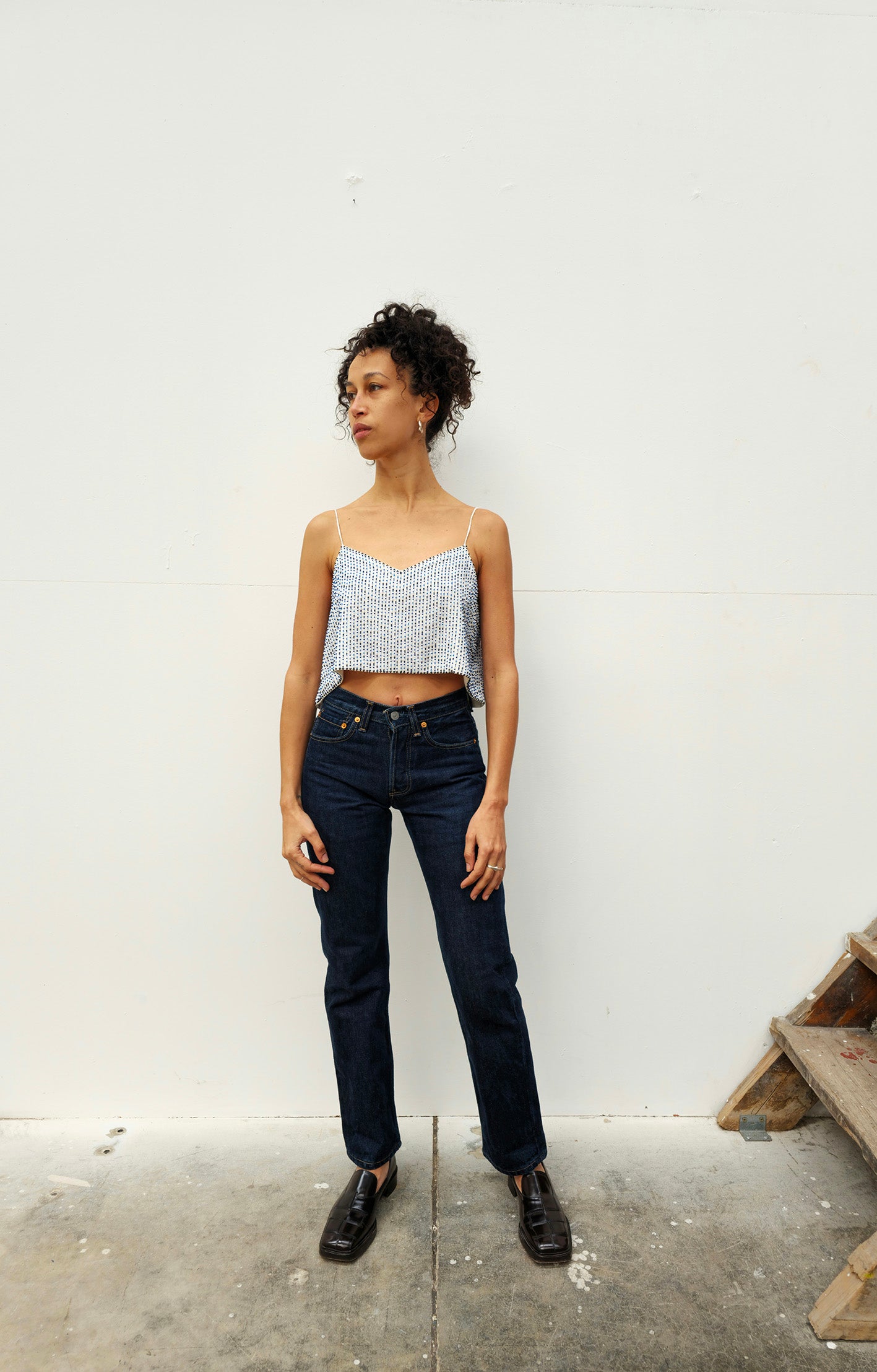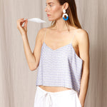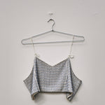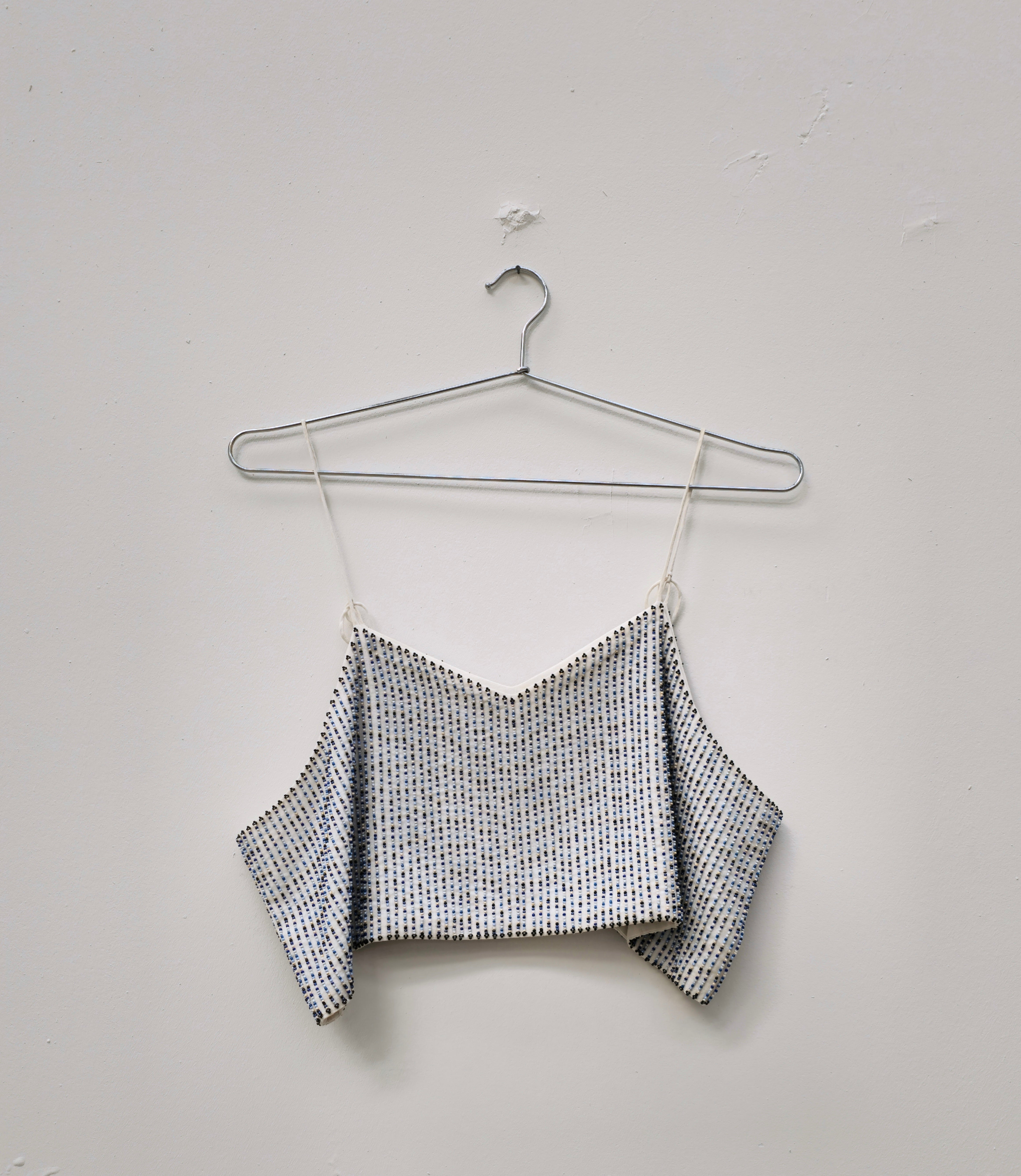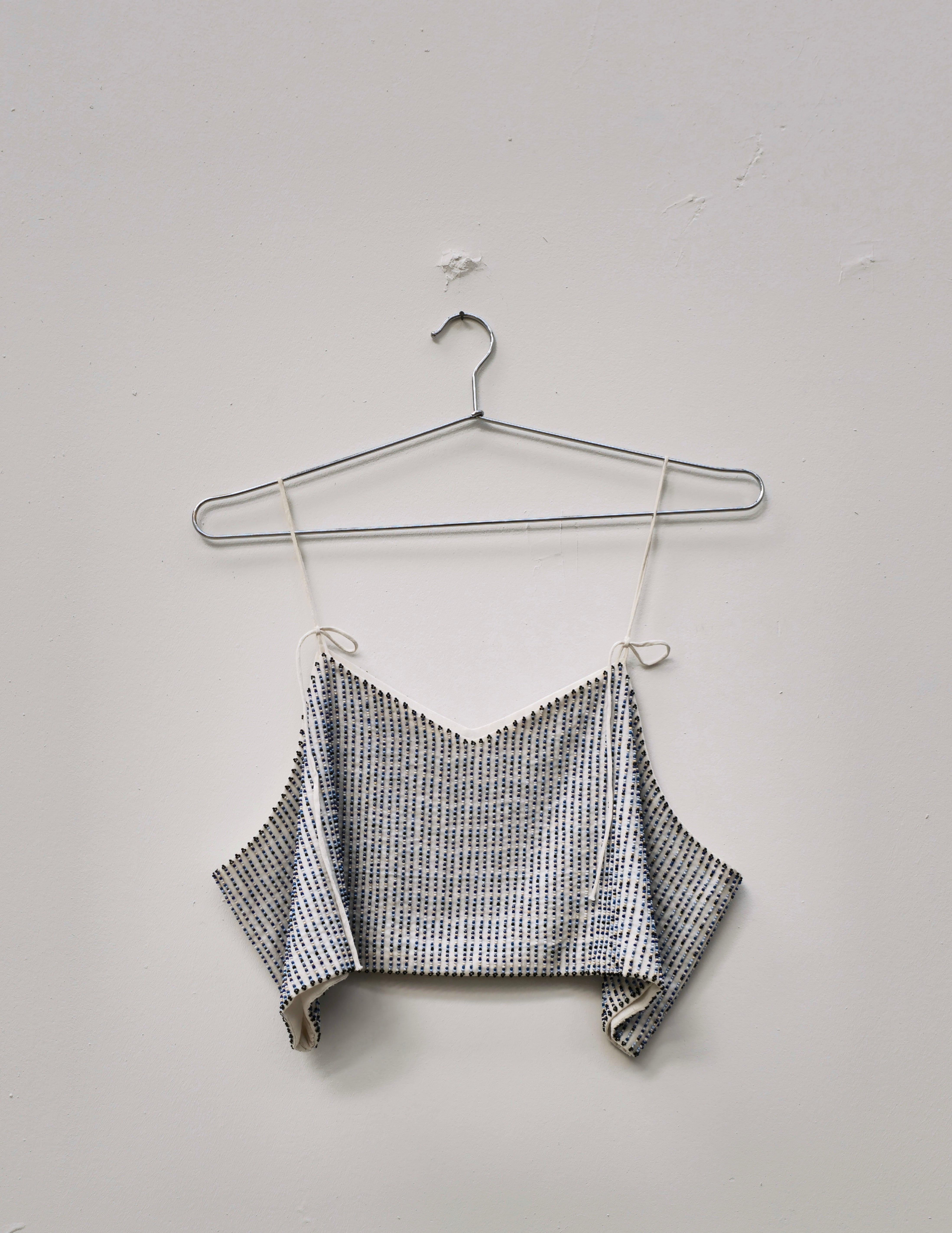 Ce haut perlé unique en son genre est un haut fabriqué à la main en 100 % coton avec des lignes verticales de perles chacune soigneusement brodée à la main. Bretelles réglables et coupe surdimensionnée pour s'adapter à une gamme de formes et de tailles. Cette pièce peut être portée en version superposée, avec un pantalon ou un jean, ou encore avec une veste.