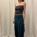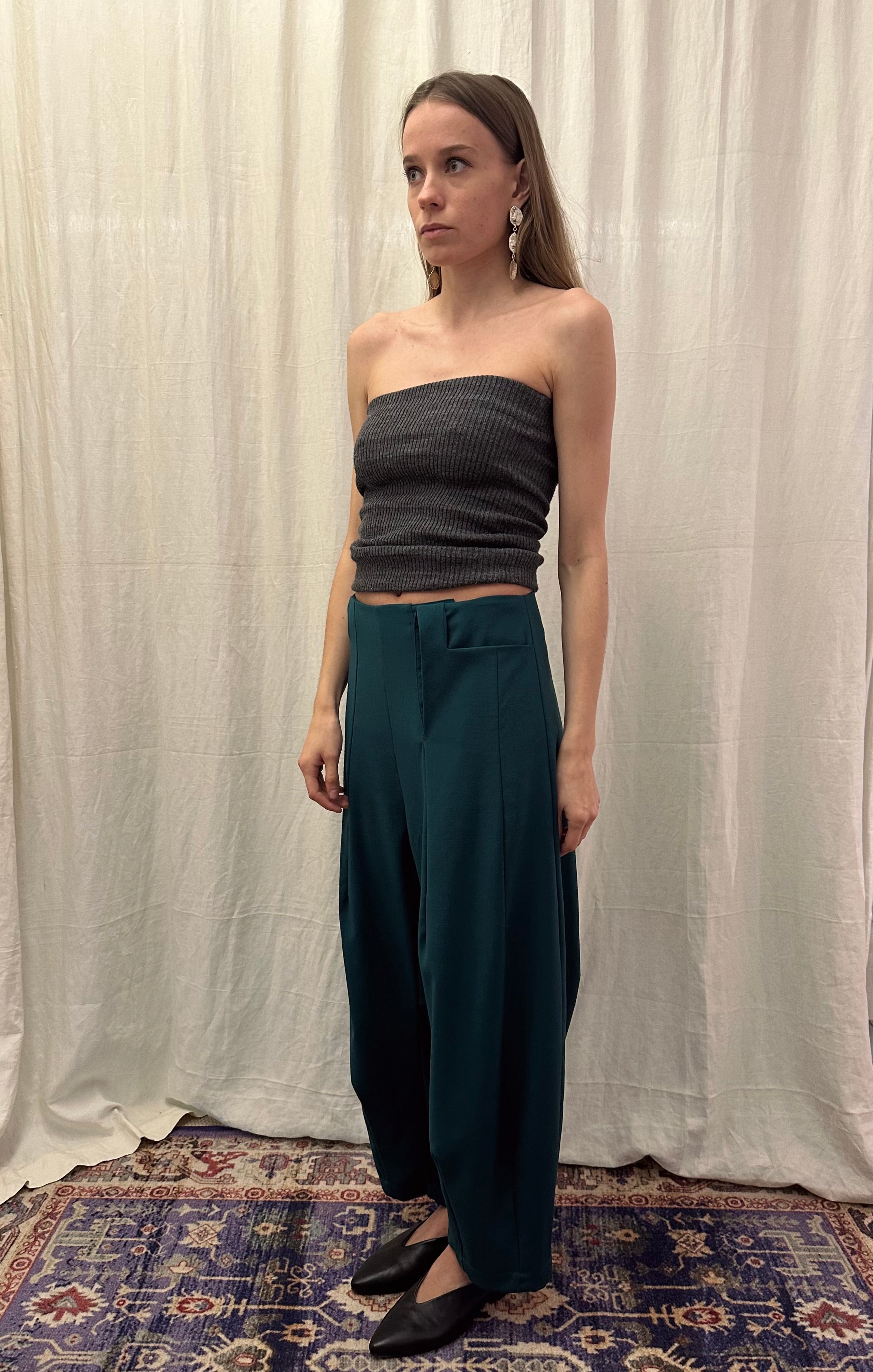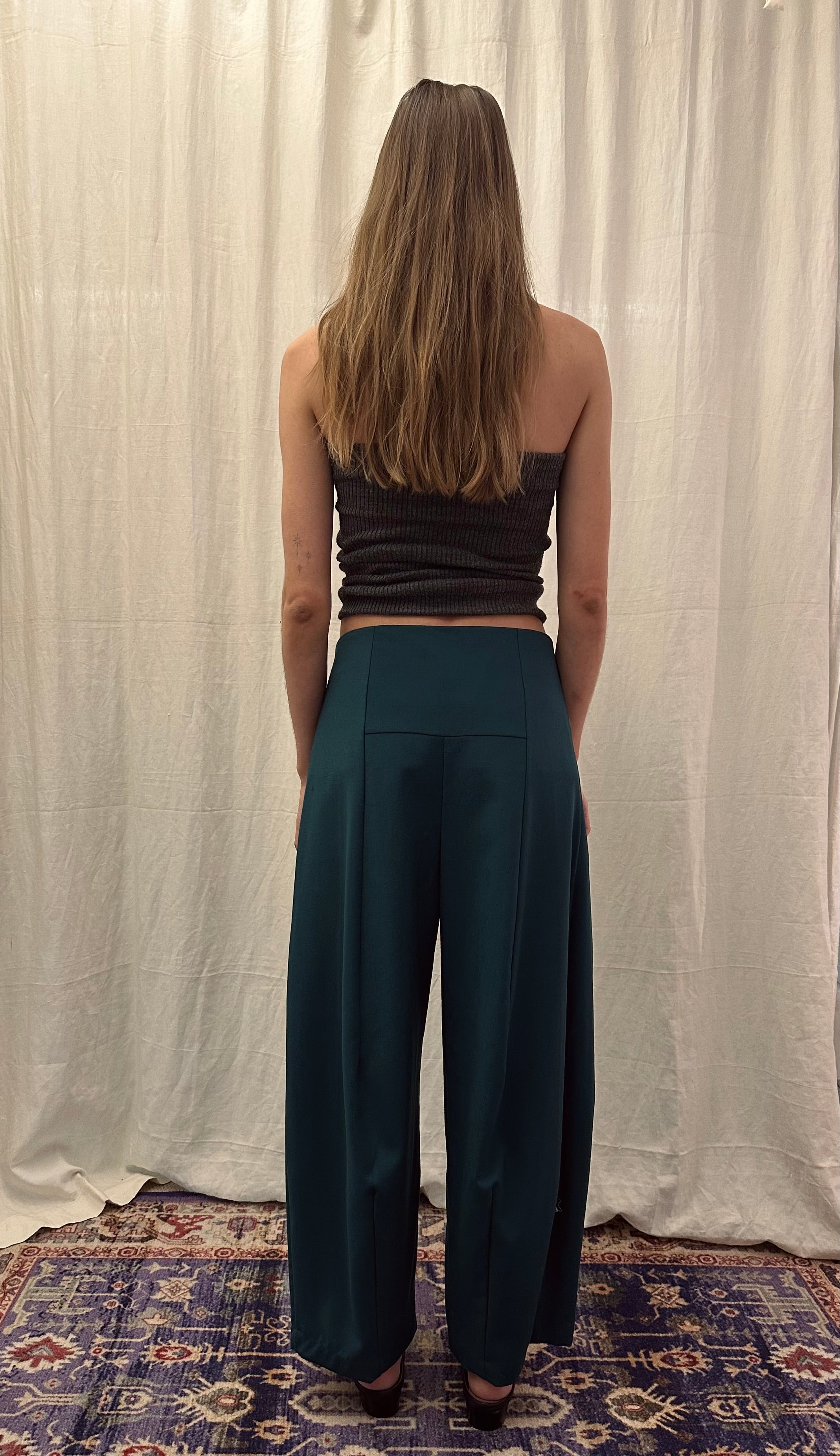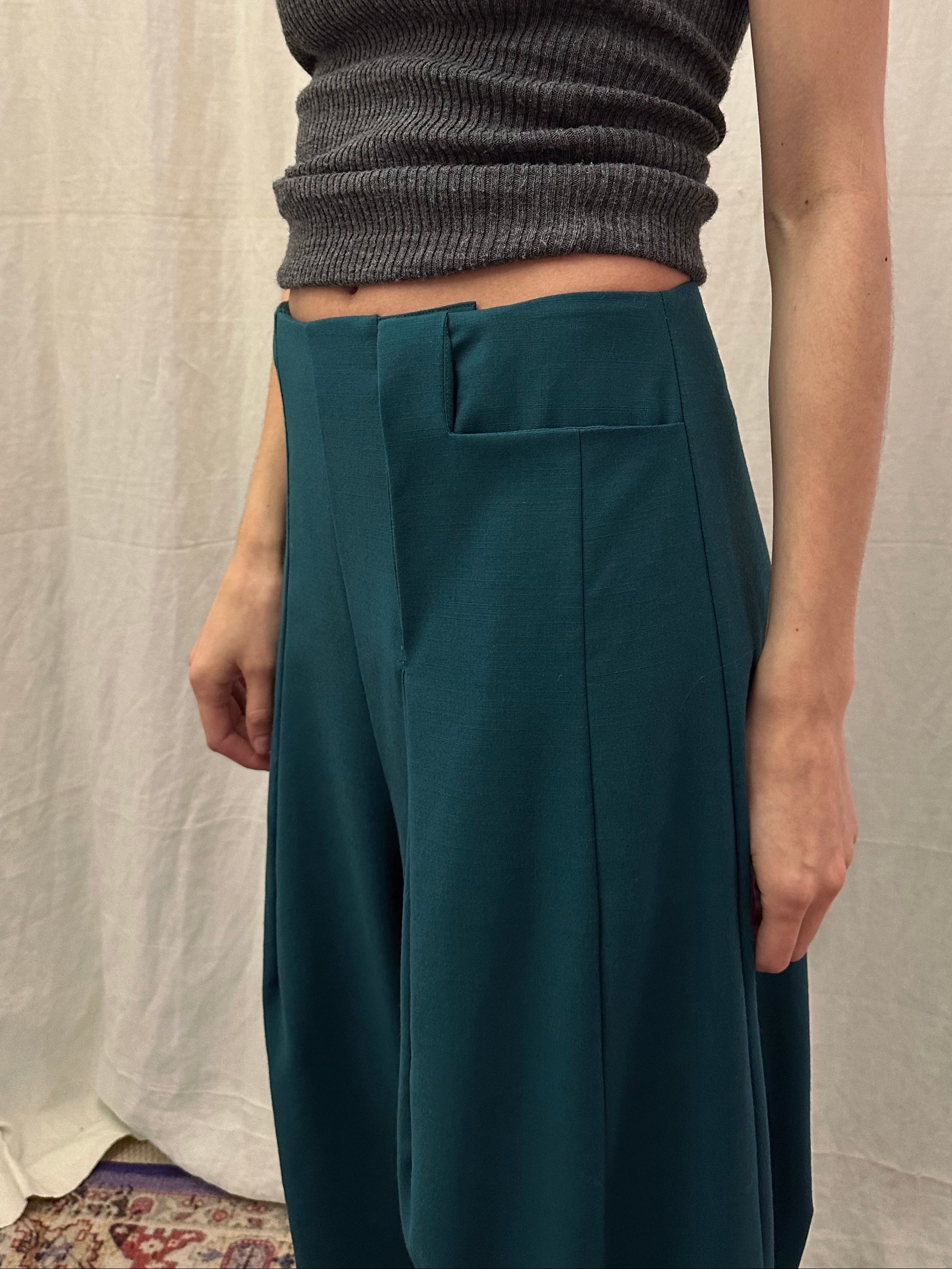 The wide-leg silhouette creates soft volume and movement, while the structured waist offers a clean, flattering fit. The deep green tone adds depth and versatility, making these trousers easy to style from day to evening.